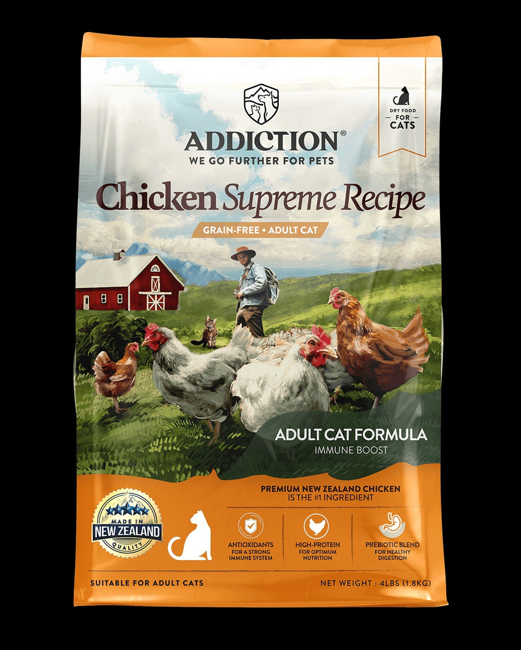 A well-balanced and nourishing diet helps cats strengthen their immune system. Chicken Supreme Recipe for Adult Cats is formulated with Addiction’s proprietary Immune Boost formula, a nutritionist-designed blend of vitamins, minerals and phytonutrients to help keep your cats healthy. It’s enriched with prebiotics from Flaxseed and Inulin to promote good digestion and has high protein levels at 40% for optimum nutrition. With premium Chicken as the #1 ingredient, Chicken Supreme Recipe for Adult Cats offers a full, rich flavor that cats find irresistible.